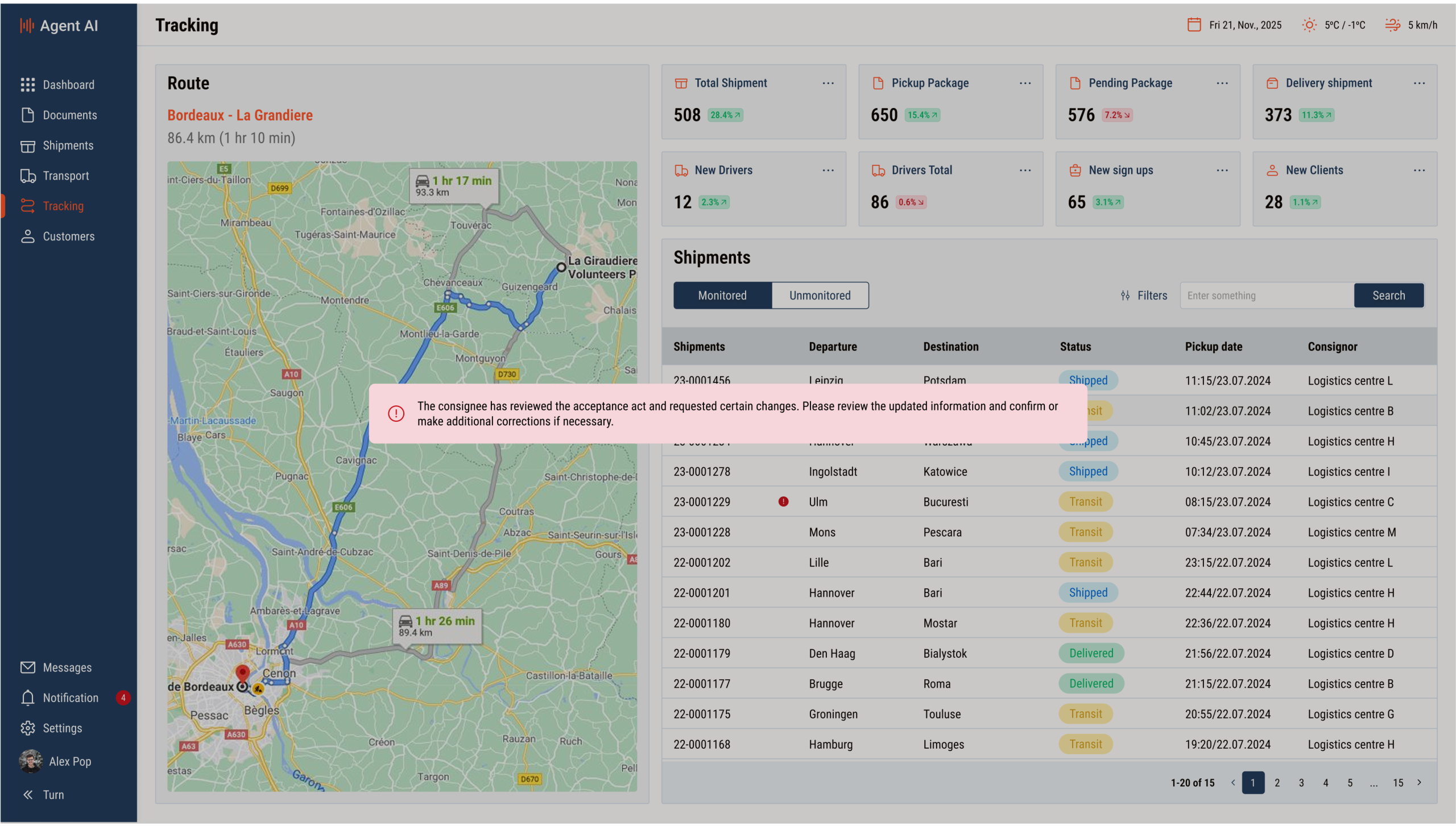 A custom AI logistics agent was designed and implemented to automate document processing, shipment coordination, multilingual communication, and risk analytics with full integration into the existing TMS.