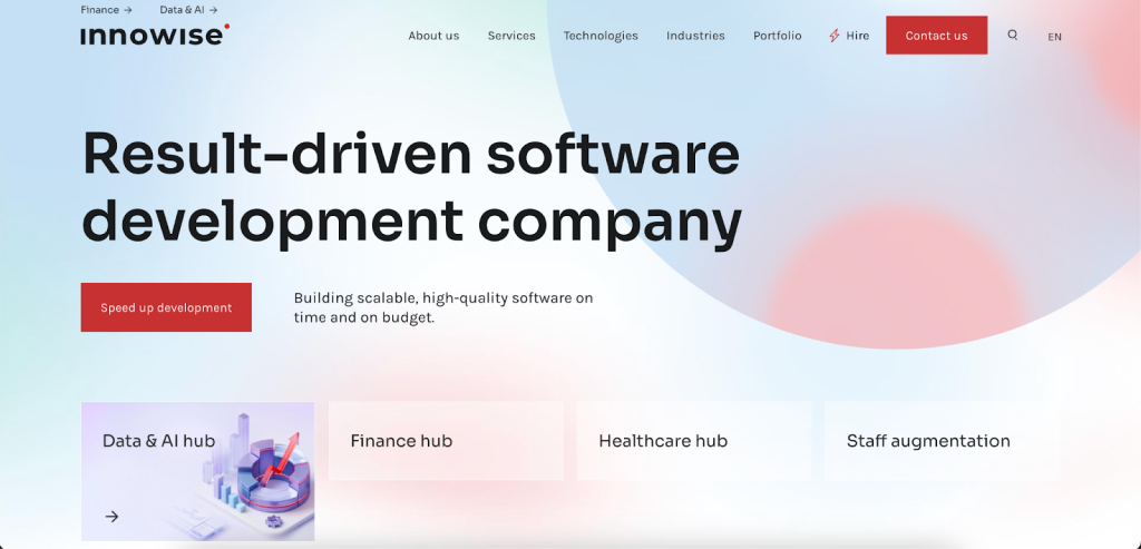 Innowise is a large international development company with a rather strong presence in the enterprise segment. The company has multiple offices across Europe and USA. Web development is part of a broader service offering that includes cloud solutions, data platforms, and system integrations.